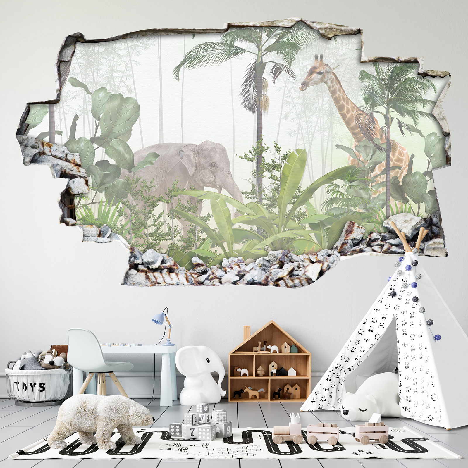 www.lumalea.it > Adesivi > Adesivi Murali Effetto 3D > Adesivi Effetto 3D Buco nel Muro > Modello 1 > Adesivo murale effetto 3D - Animali della Foresta Tropicale