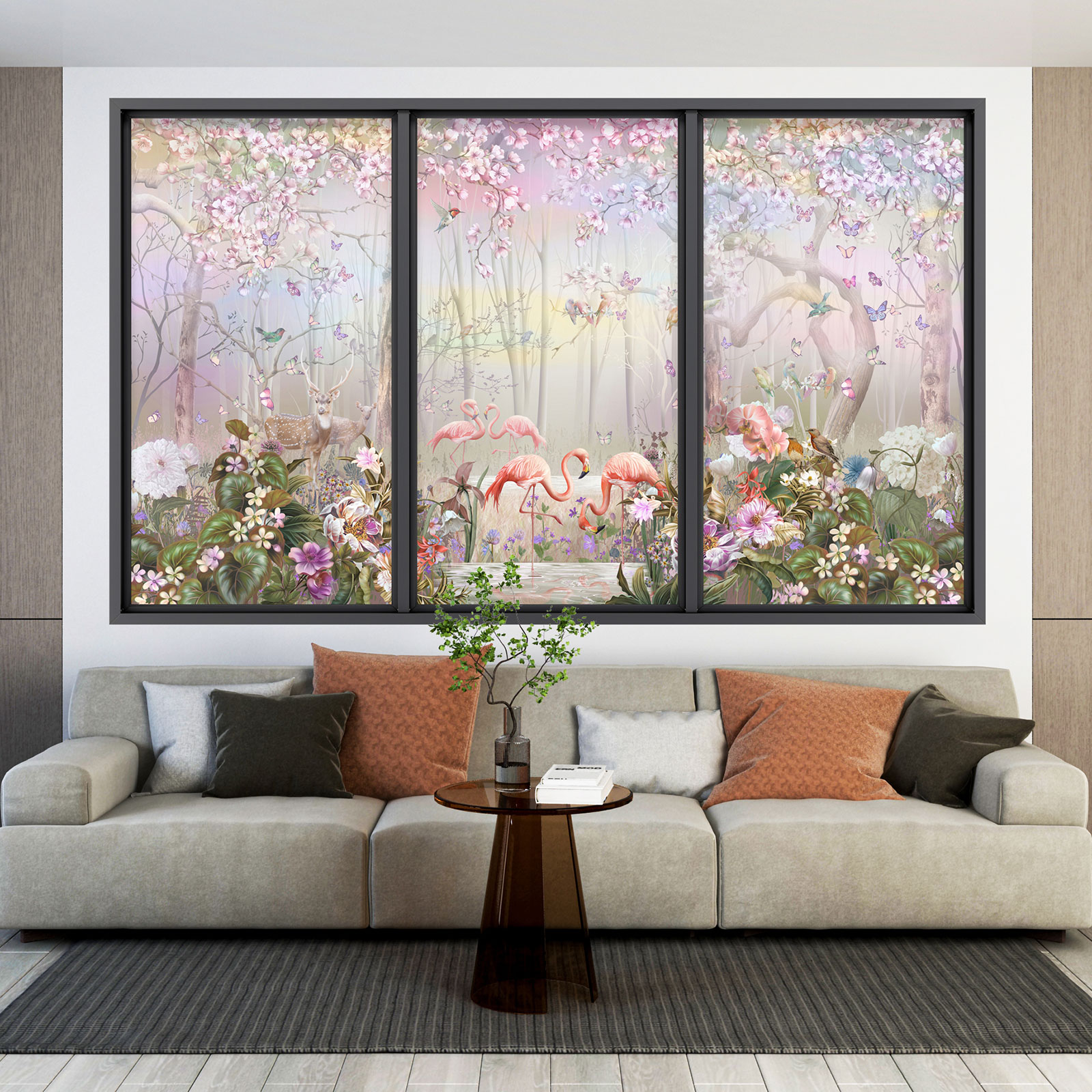 Adesivo Murale - Illusione ottica - Finestra - Fenicotteri Rosa