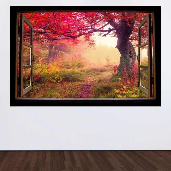 Adesivo Murale - Illusione ottica - Finestra in legno - Alberi foglie rosse