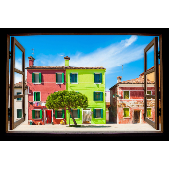 Adesivo Murale - Illusione ottica - Finestra in legno - Case colorate