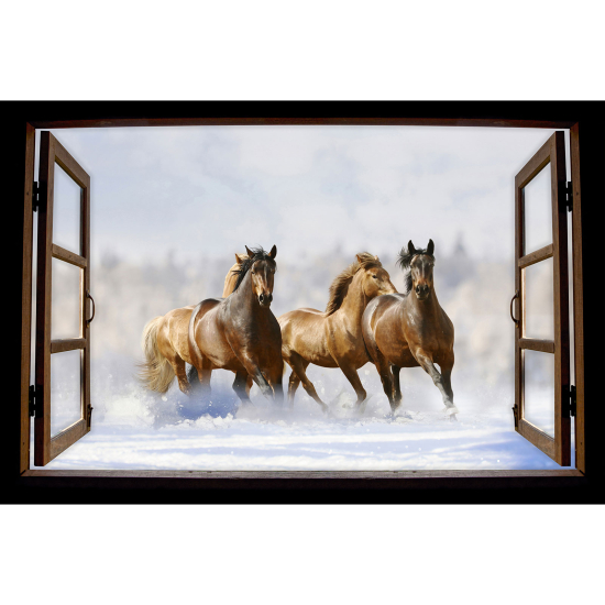 Adesivo Murale - Illusione ottica - Finestra in legno - Cavalli