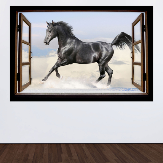 Adesivo Murale - Illusione ottica - Finestra in legno - Cavallo