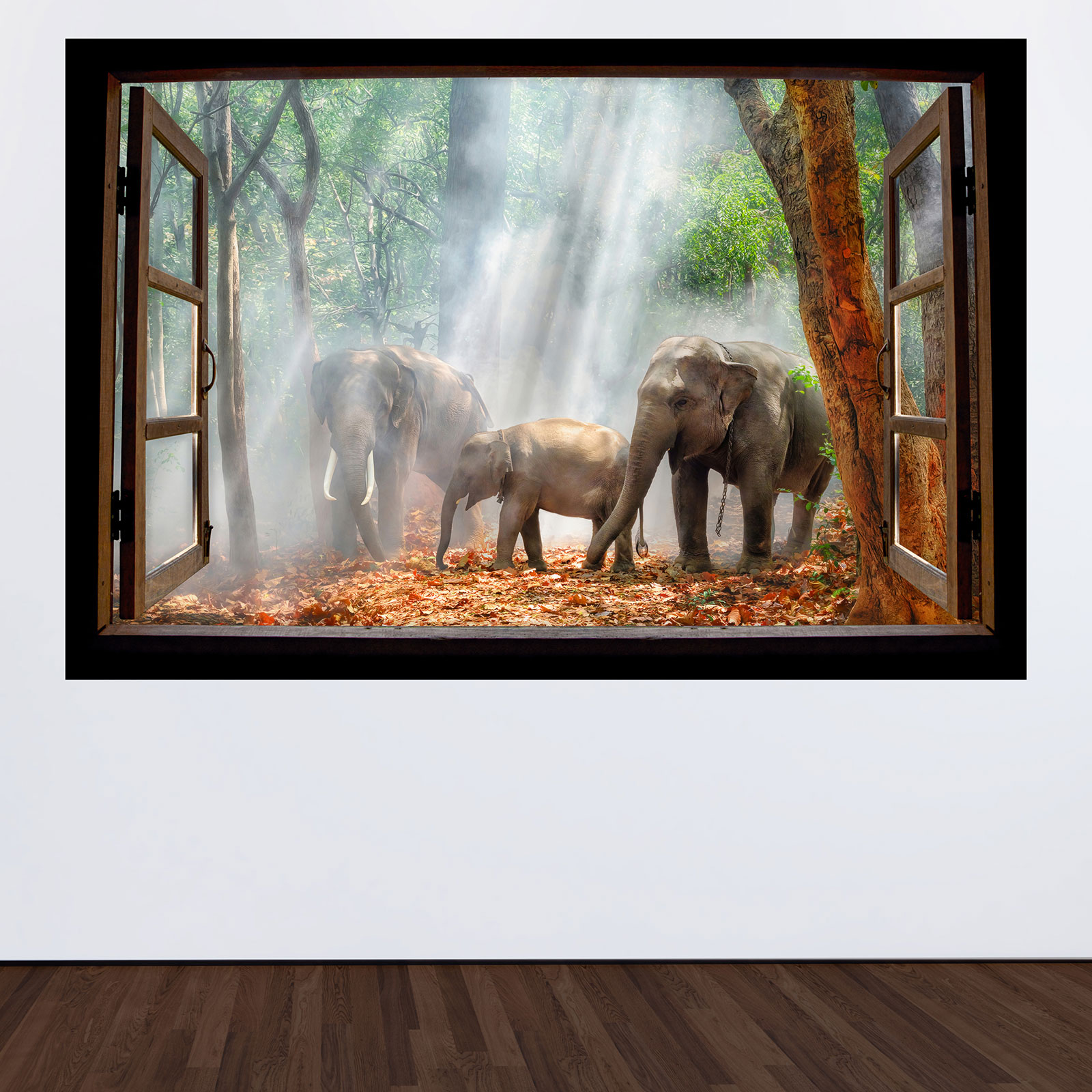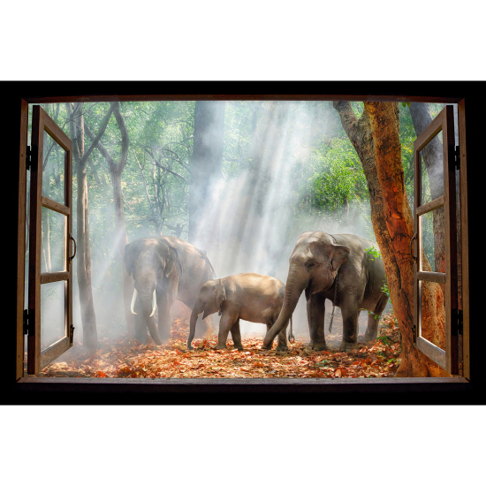 Adesivo Murale - Illusione ottica - Finestra in legno - Elefanti