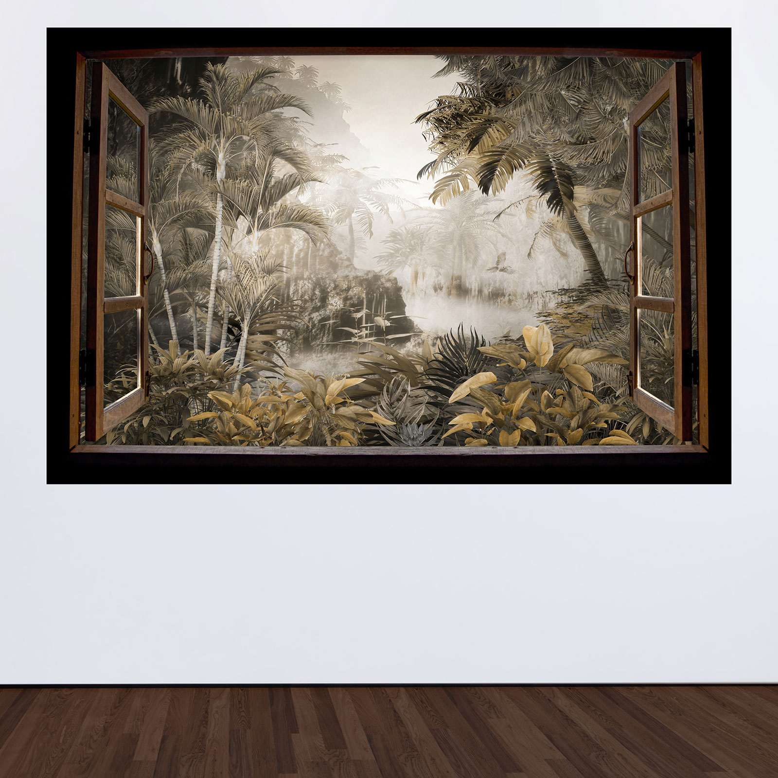 www.lumalea.it > Adesivi > Adesivi Murali Effetto 3D > Adesivi Murali Finestre in Legno > Adesivo Murale - Illusione ottica - Finestra in legno - Giungla