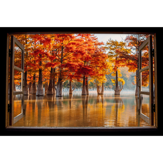 Adesivo Murale - Illusione ottica - Finestra in legno - Lago e alberi