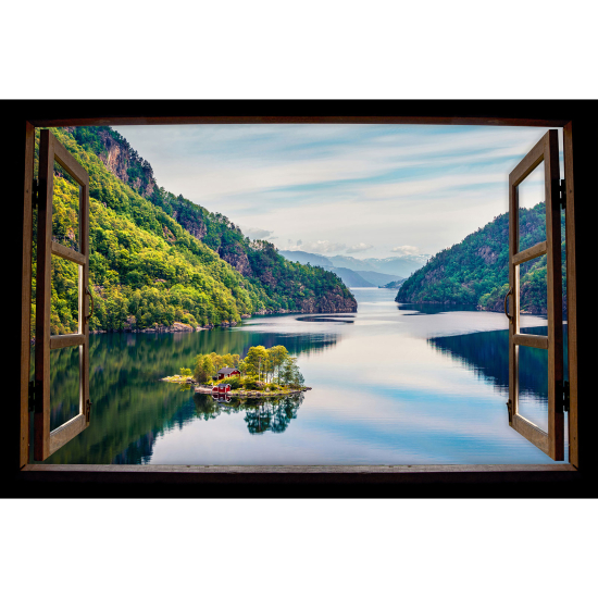 Adesivo Murale - Illusione ottica - Finestra in legno - Lago Montagne