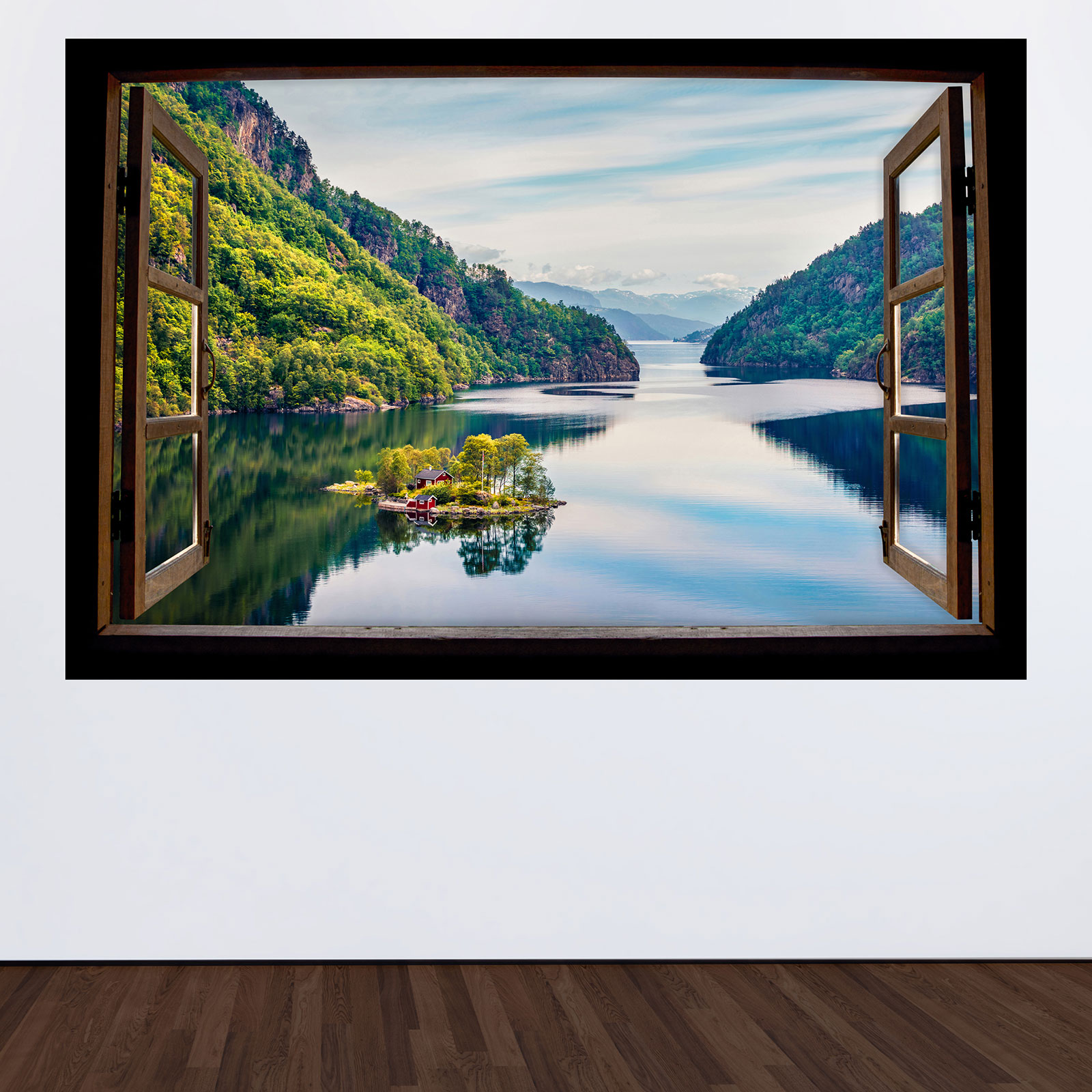 www.lumalea.it > Adesivi > Adesivi Murali Effetto 3D > Adesivi Murali Finestre in Legno > Adesivo Murale - Illusione ottica - Finestra in legno - Lago Montagne