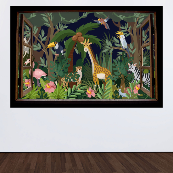 Adesivo Murale - Illusione ottica - Finestra in legno per Bambini - Giungla