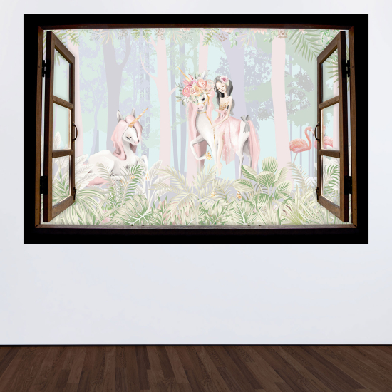 Adesivo Murale - Illusione ottica - Finestra in legno per Bambini - Ragazza e unicorni