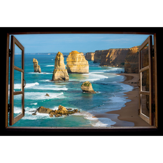 Adesivo Murale - Illusione ottica - Finestra in legno - Scogliere