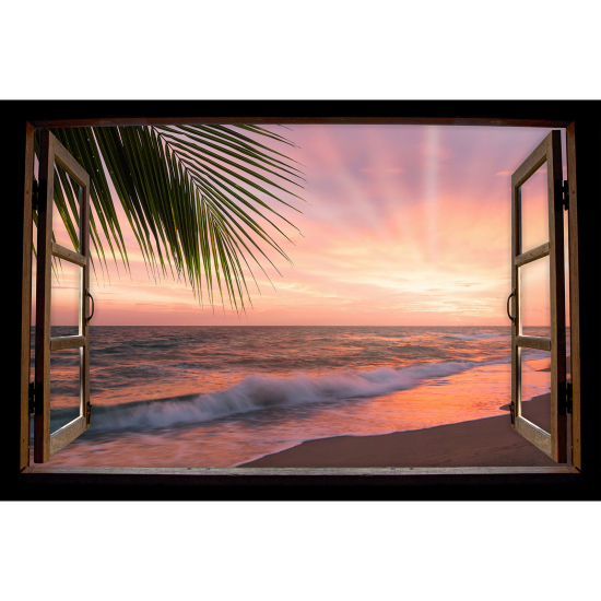Adesivo Murale - Illusione ottica - Finestra in legno - Spiaggia tramonto
