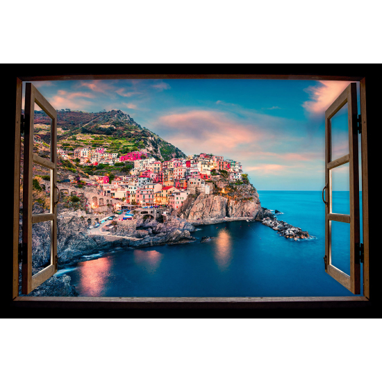 Adesivo Murale - Illusione ottica - Finestra in legno - Vista mare