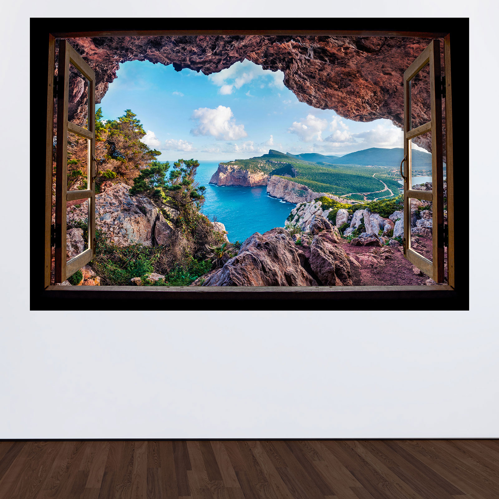www.lumalea.it > Adesivi > Adesivi Murali Effetto 3D > Adesivi Murali Finestre in Legno > Adesivo Murale - Illusione ottica - Finestra in legno - Vista mare