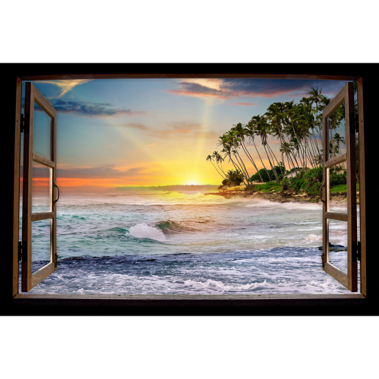 Adesivo Murale - Illusione ottica - Finestra in legno - Vista mare palme