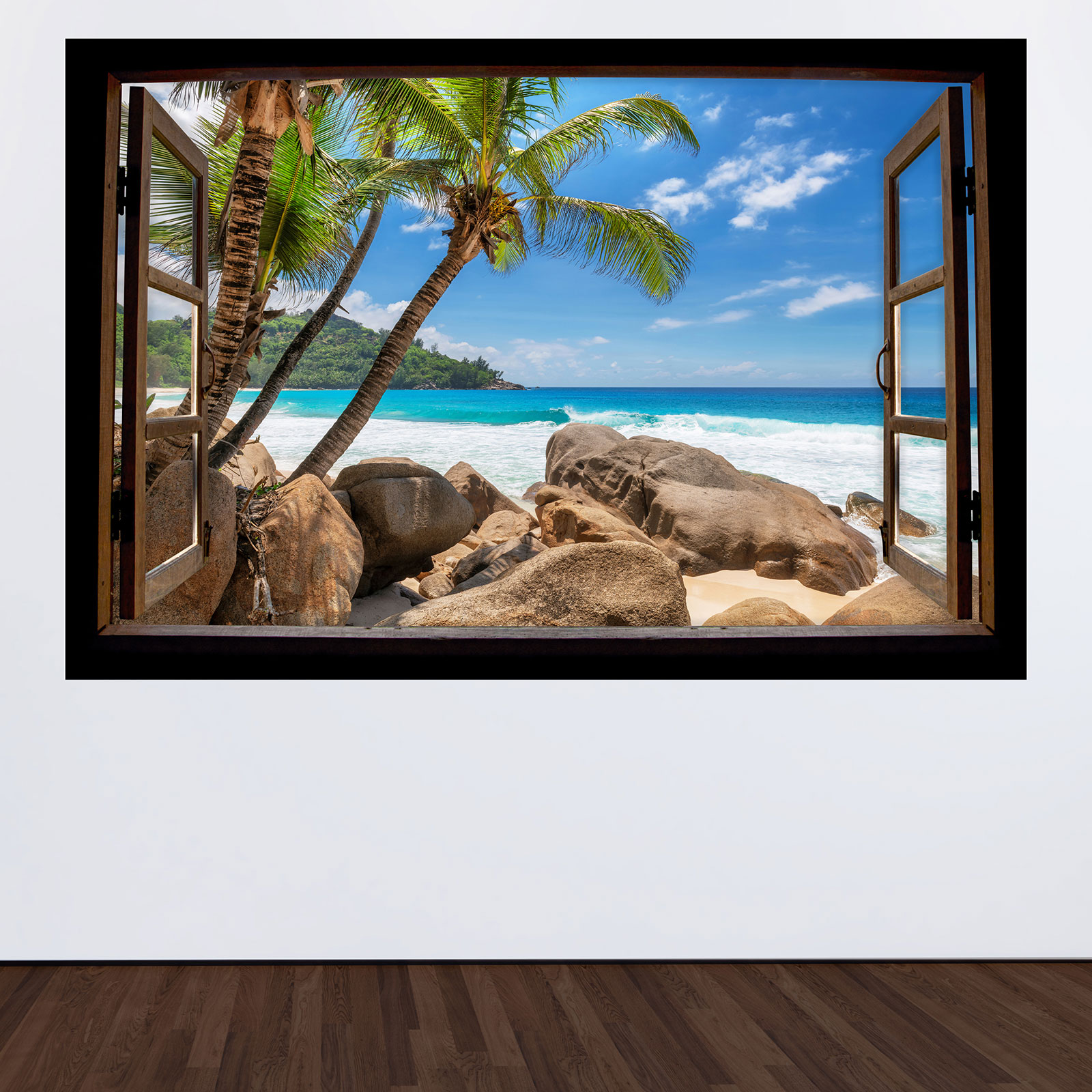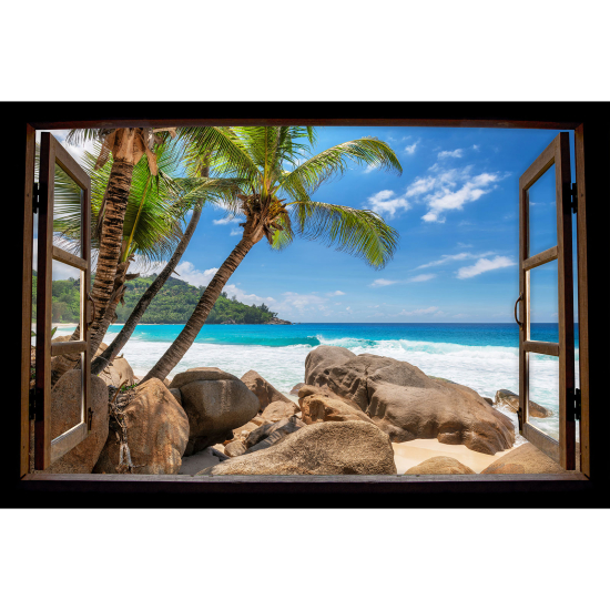 Adesivo Murale - Illusione ottica - Finestra in legno - Vista mare palme