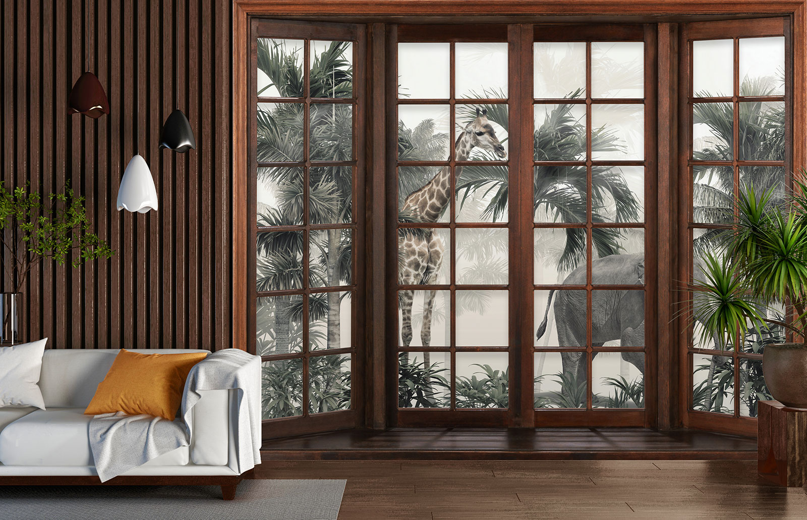 Carta da parati panoramica - Illusione ottica - Finestra in legno - Animali della Giungla