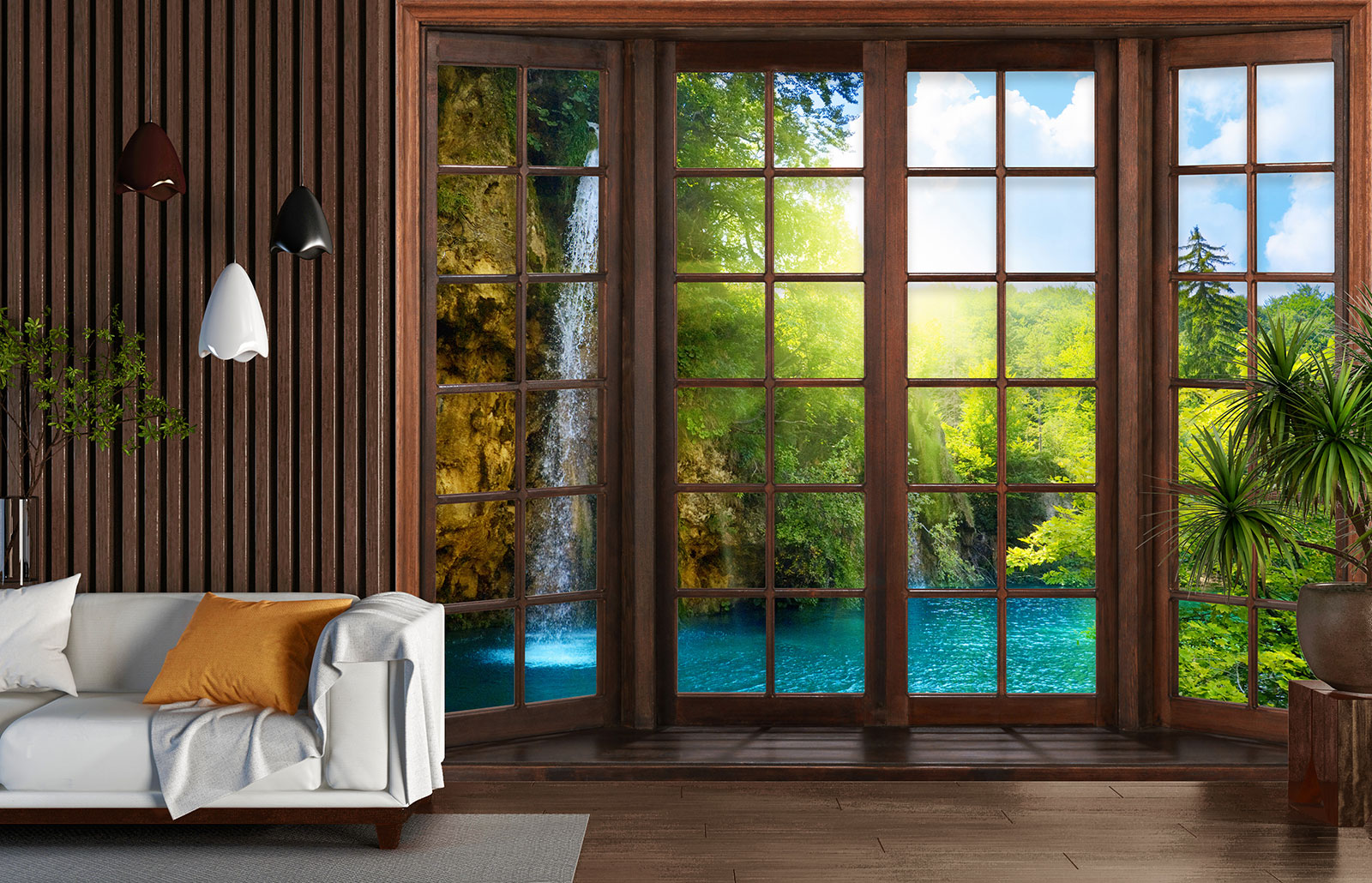 Carta da parati panoramica - Illusione ottica - Finestra in legno - Cascata