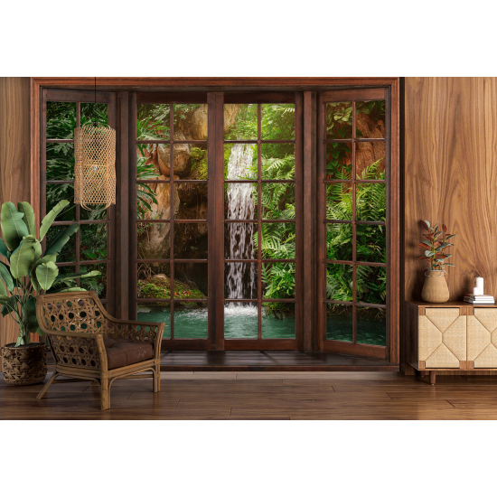 Carta da parati panoramica - Illusione ottica - Finestra in legno - Cascata