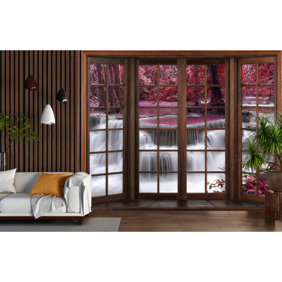 Carta da parati panoramica - Illusione ottica - Finestra in legno - Cascate