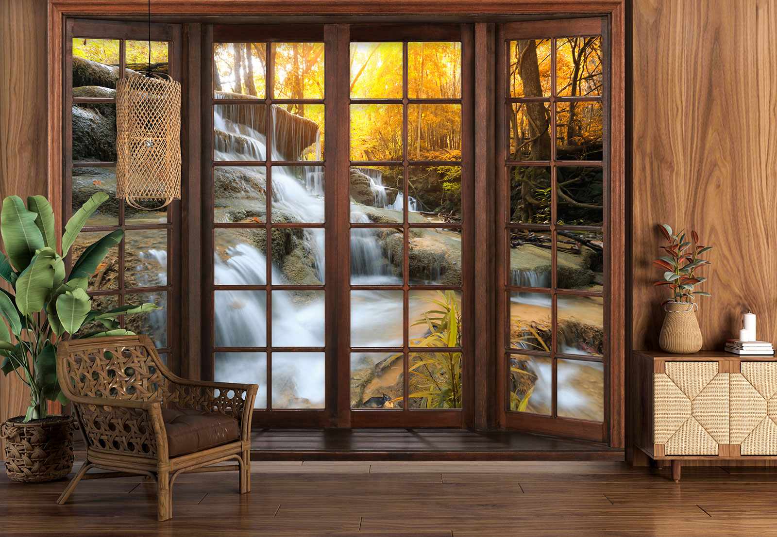 Carta da parati panoramica - Illusione ottica - Finestra in legno - Cascate