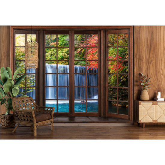 Carta da parati panoramica - Illusione ottica - Finestra in legno - Cascate