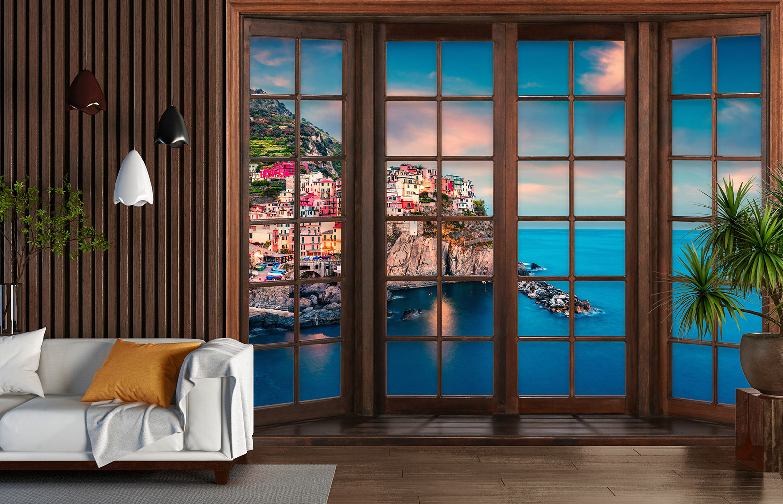 Carta da parati panoramica - Illusione ottica - Finestra in legno - Cinque Terre