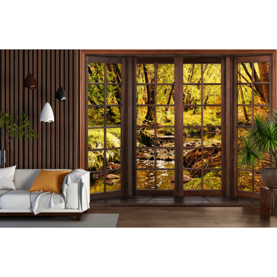 Carta da parati panoramica - Illusione ottica - Finestra in legno - Fiume foresta