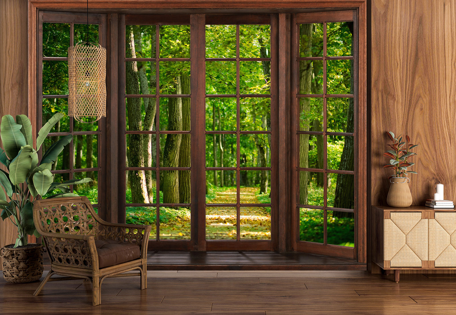 Carta da parati panoramica - Illusione ottica - Finestra in legno - Foresta