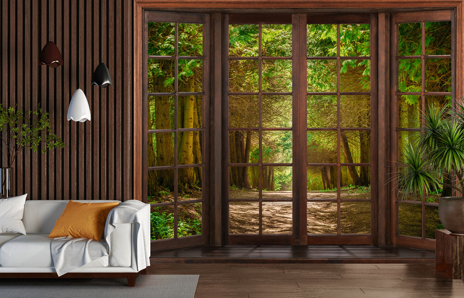 Carta da parati panoramica - Illusione ottica - Finestra in legno - Foresta
