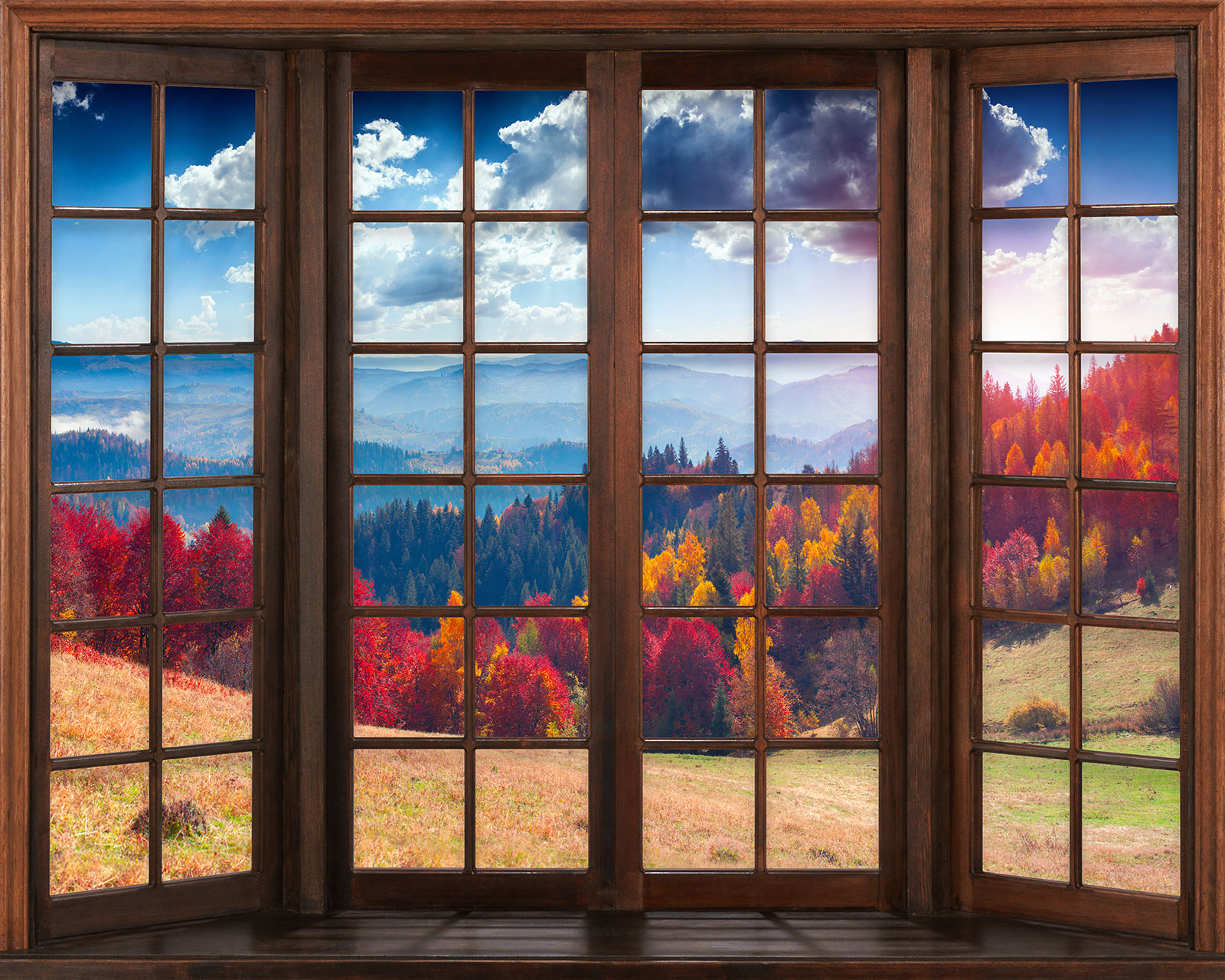 Carta da parati panoramica - Illusione ottica - Finestra in legno - Foresta autunno