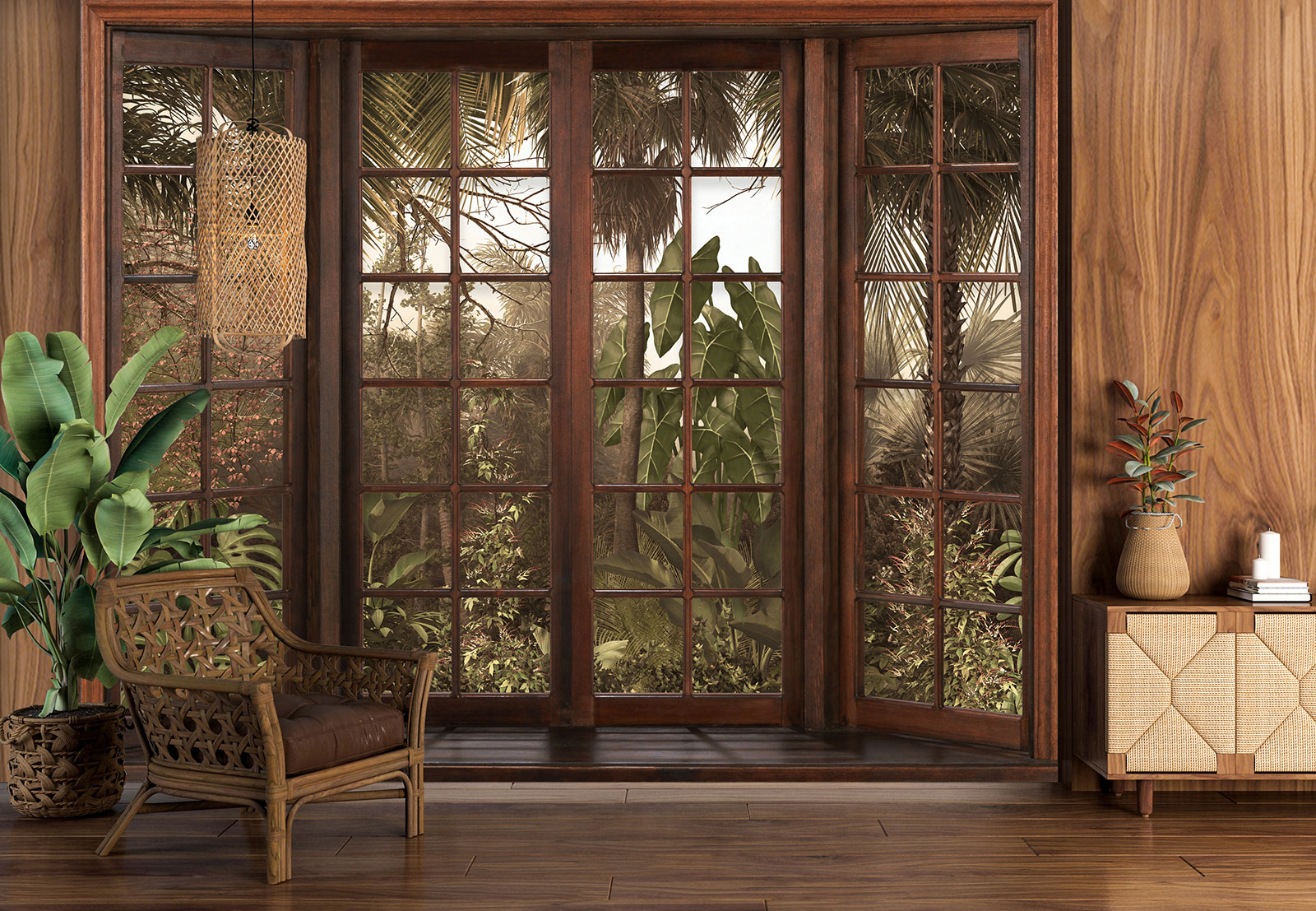 Carta da parati panoramica - Illusione ottica - Finestra in legno - Foresta Tropicale