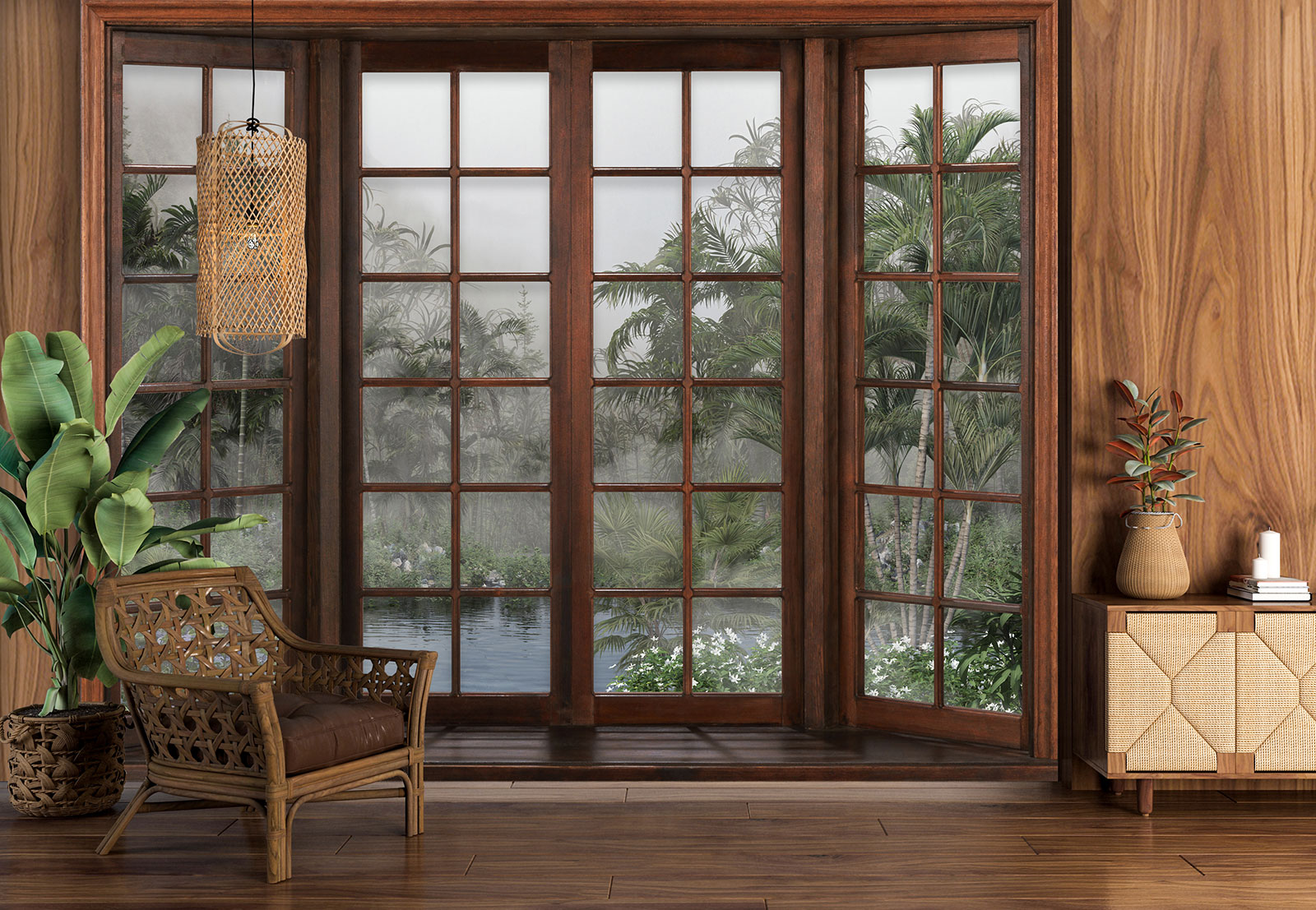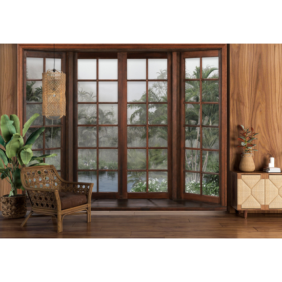 Carta da parati panoramica - Illusione ottica - Finestra in legno - Foresta Tropicale