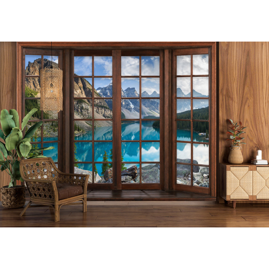Carta da parati panoramica - Illusione ottica - Finestra in legno - Lago Montagne