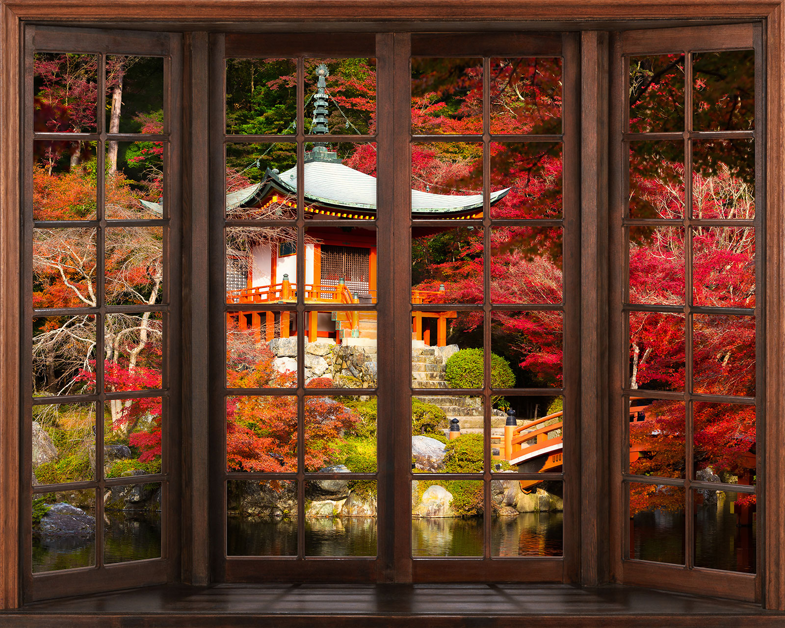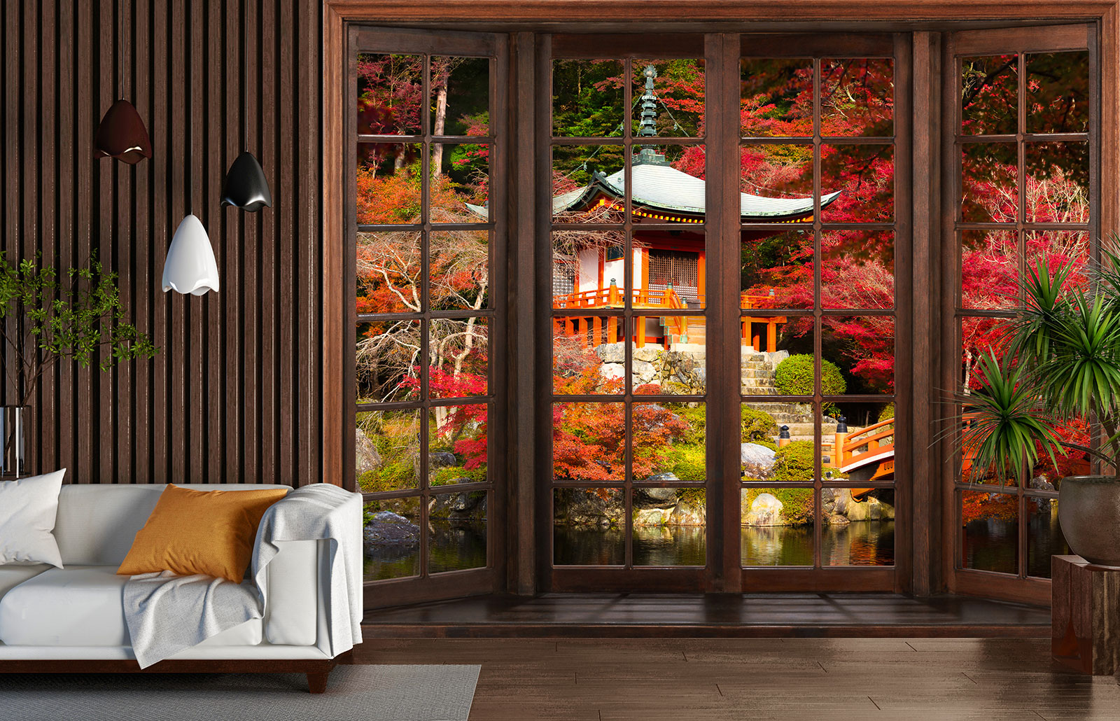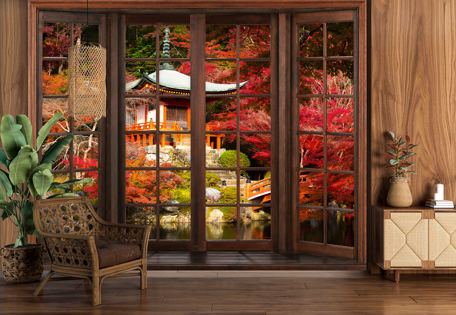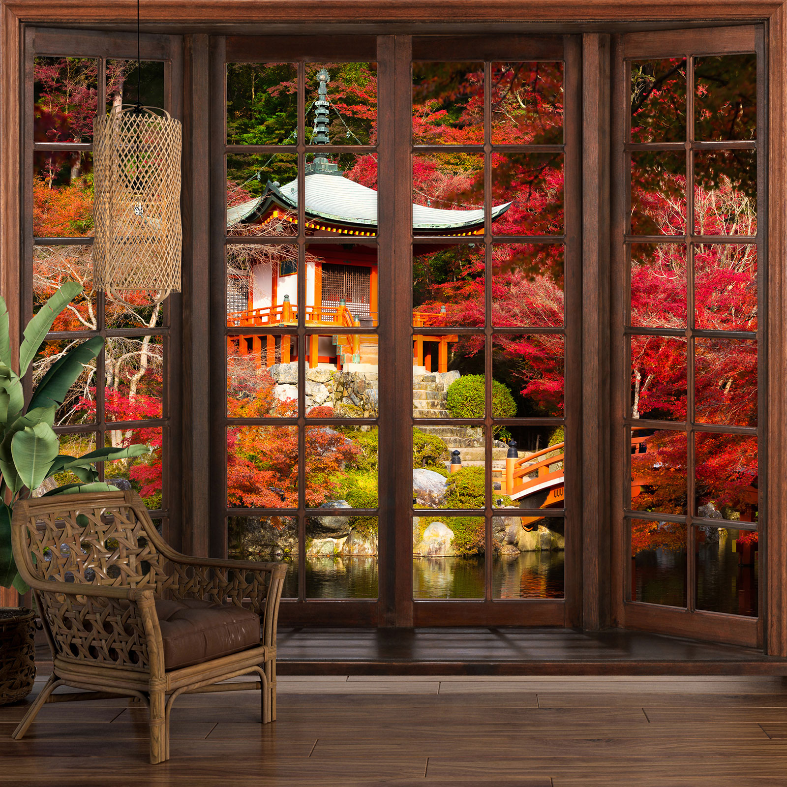 Carta da parati panoramica - Illusione ottica - Finestra in legno - Tempio Giapponese
