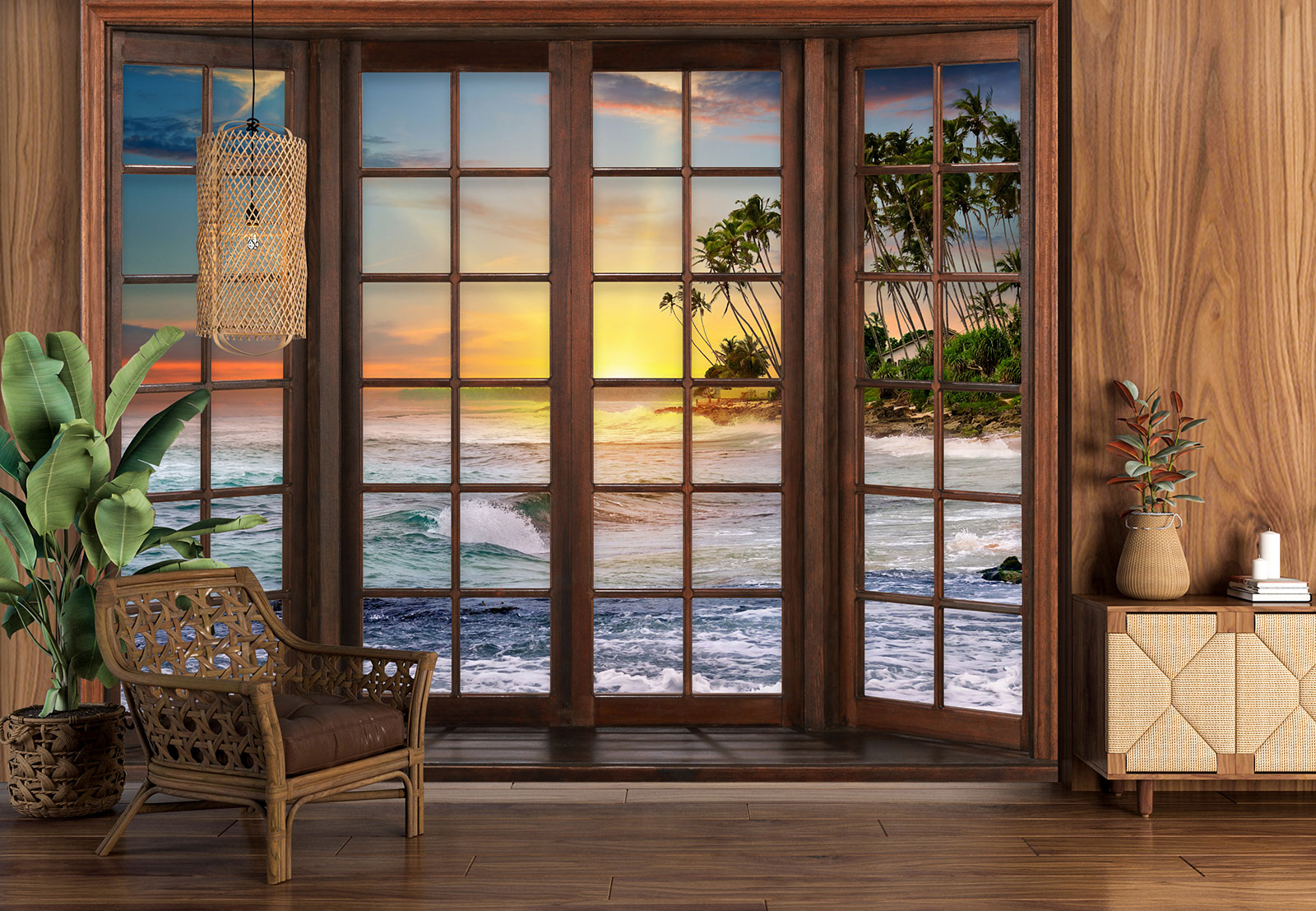 Carta da parati panoramica - Illusione ottica - Finestra in legno - Vista Mare