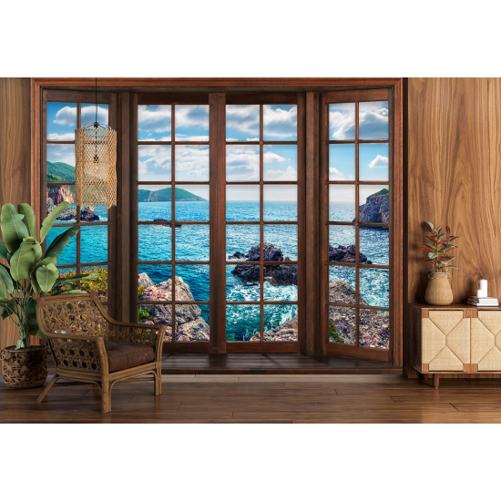 Carta da parati panoramica - Illusione ottica - Finestra in legno - Vista Mare