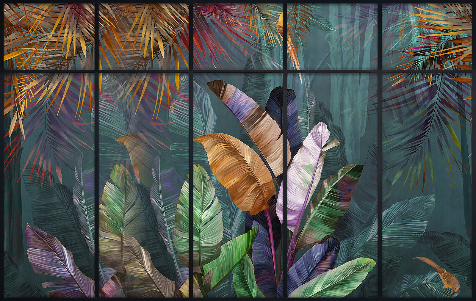 www.lumalea.it > Carte da parati > Carta da Parati Panoramica > Carta da Parati Effetto 3D > Vetrate Effetto 3D > Carta da parati panoramica - Illusione ottica - Piante tropicali