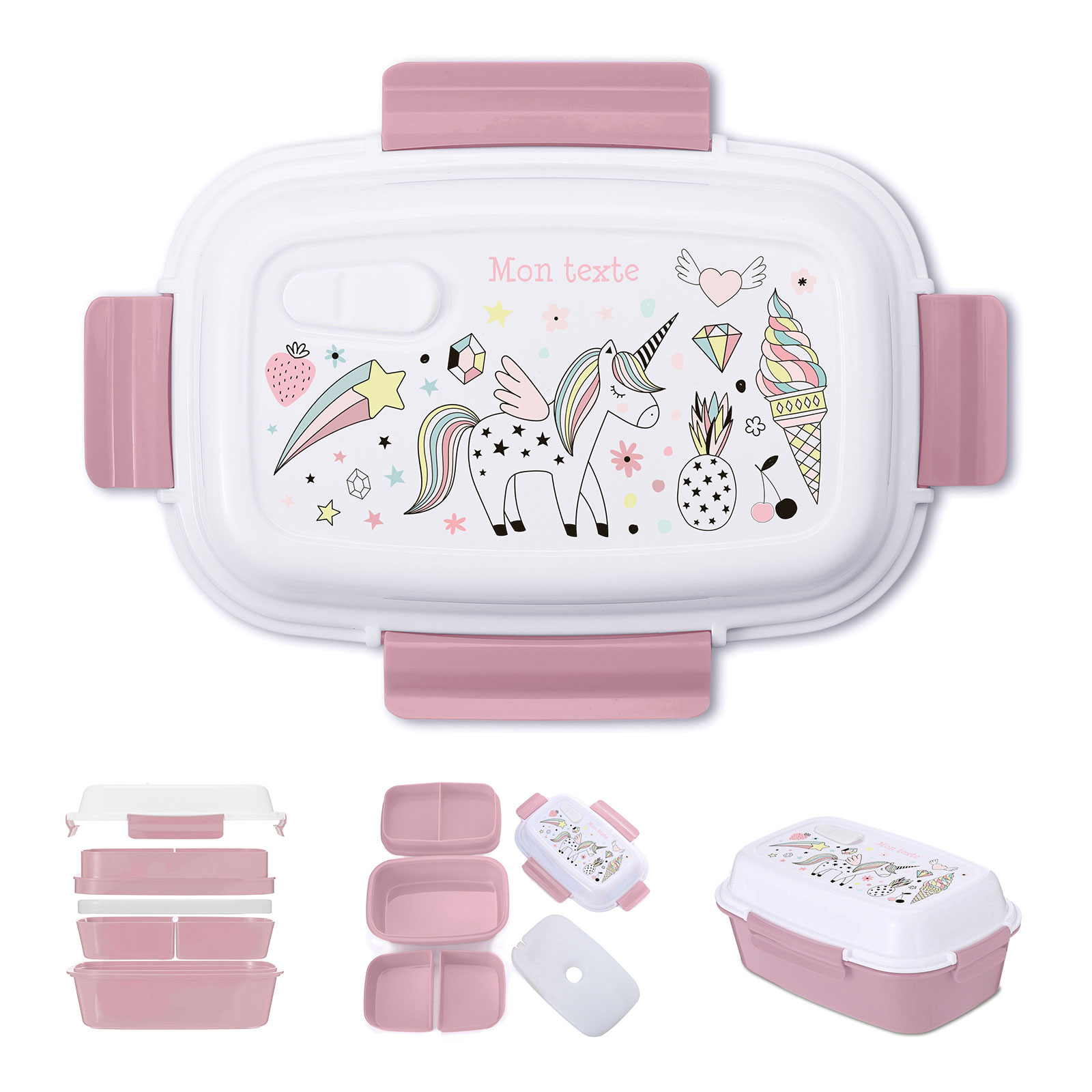 Con una capacità di 1000 ml, queste scatole pranzo personalizzate sono divise in tre compartimenti modulari e sono dotate di un blocco ghiaccio removibile per mantenere gli alimenti freschi. Il loro coperchio ermetico può essere personalizzato con un incantevole motivo e il nome del vostro bambino.