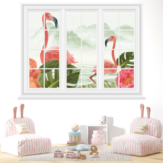 Adesivo Murale - Illusione ottica - Finestra - Fenicotteri rosa