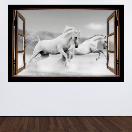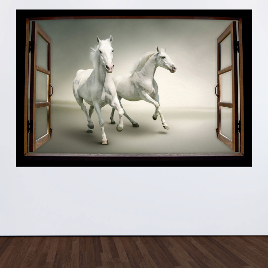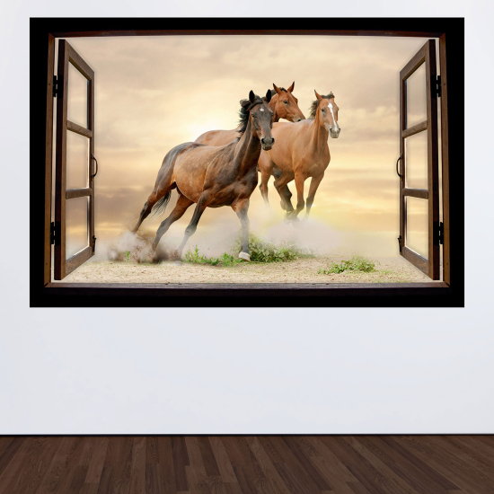 Adesivo Murale - Illusione ottica - Finestra in legno - Cavalli