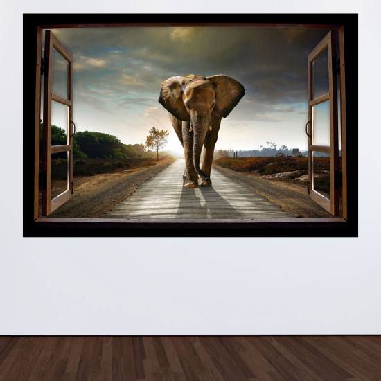 Adesivo Murale - Illusione ottica - Finestra in legno - Elefante