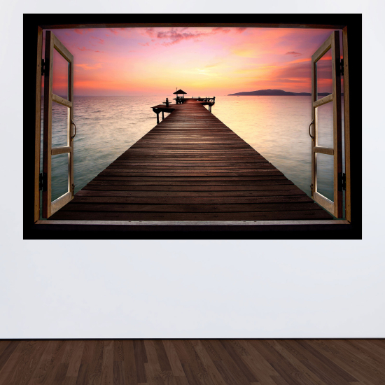 Adesivo Murale - Illusione ottica - Finestra in legno - Pontile al tramonto