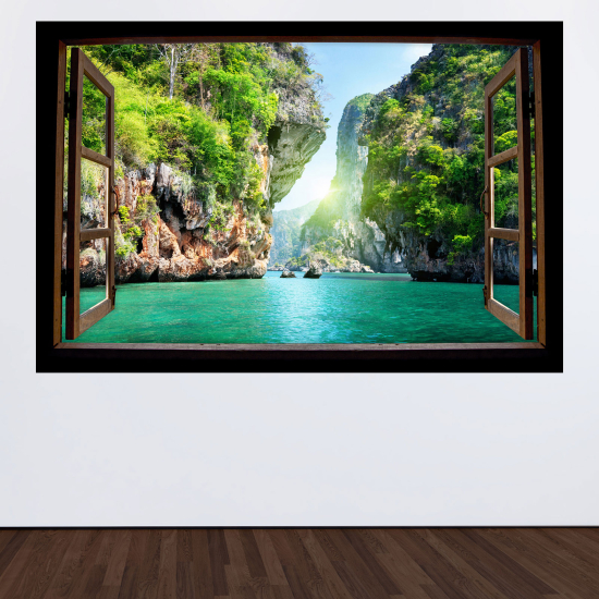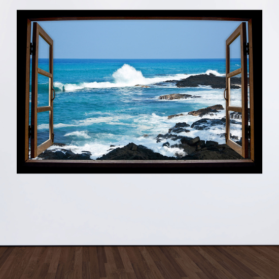 Adesivo Murale - Illusione ottica - Finestra in legno - Scogliere