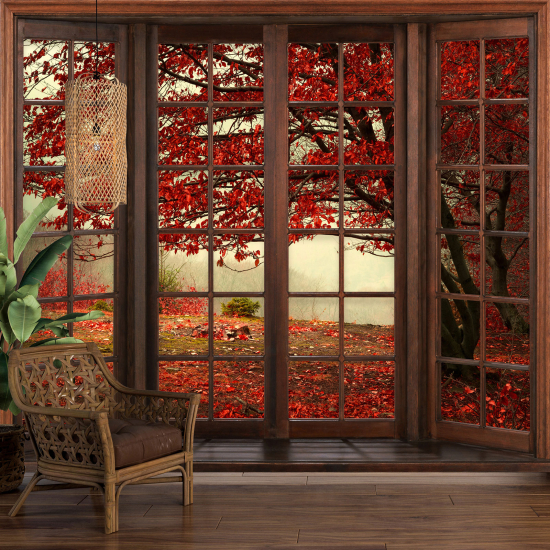 Carta da parati panoramica - Illusione ottica - Finestra in legno - Alberi foglie rosse