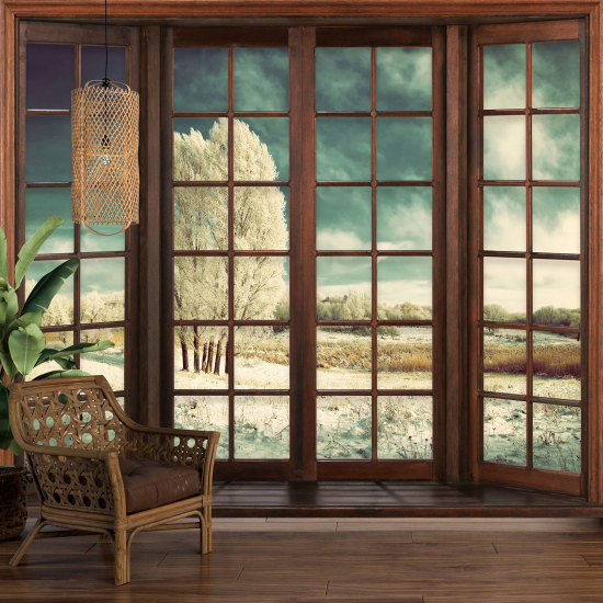Carta da parati panoramica - Illusione ottica - Finestra in legno - Paesaggio invernale