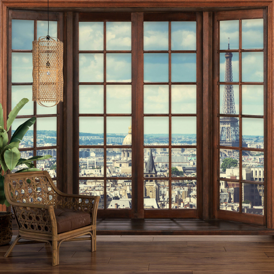 Carta da parati panoramica - Illusione ottica - Finestra in legno - Parigi Torre Eiffel