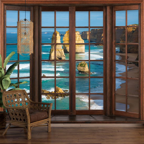 Carta da parati panoramica - Illusione ottica - Finestra in legno - Scogliere