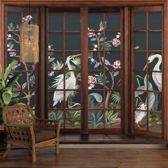 Carta da parati panoramica - Illusione ottica - Finestra in legno - Uccelli Tropicali