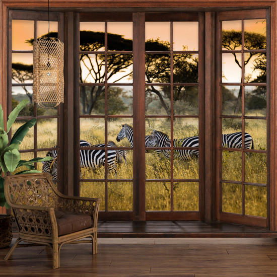 Carta da parati panoramica - Illusione ottica - Finestra in legno - Zebre Savana